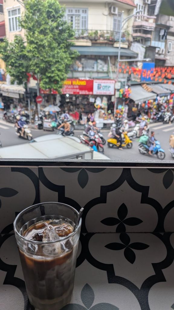 I was greeted by the staff who asked where I wanted to sit, and of course, I elected for the balcony. Once I’d selected my pew, one of the staff came and took my order for a white Vietnamese coffee at a rate of 35,000 Vietnamese Dong (£0.99/1900₩). I usually only drink plain black coffee, but the sugary condensed milk they use here in Vietnam has got me hooked.